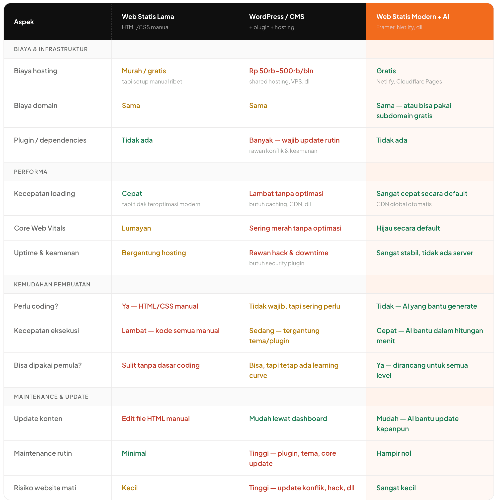 Web statis modern sudah secara alami cepat, ringan, dan SEO-friendly. Tidak perlu plugin caching, tidak perlu konfigurasi server, tidak perlu khawatir soal Core Web Vitals. Fokus bikin kontennya — teknikal sudah beres sendiri.