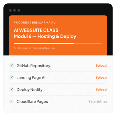 Tidak perlu background coding. Kamu mulai dari nol, belajar cara pakai AI sebagai partner bangun website — dari desain layout sampai deploy ke internet. Semua langkah dipandu secara urut, tidak loncat- loncat.